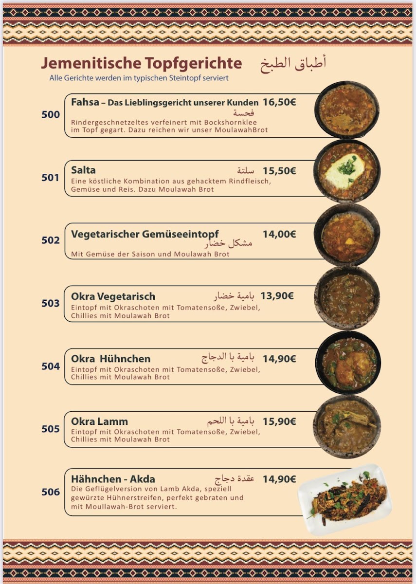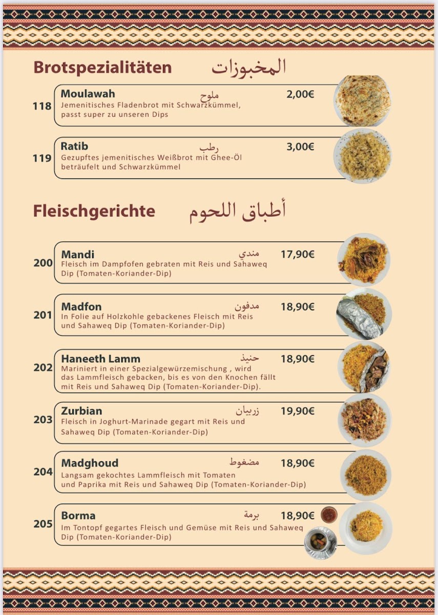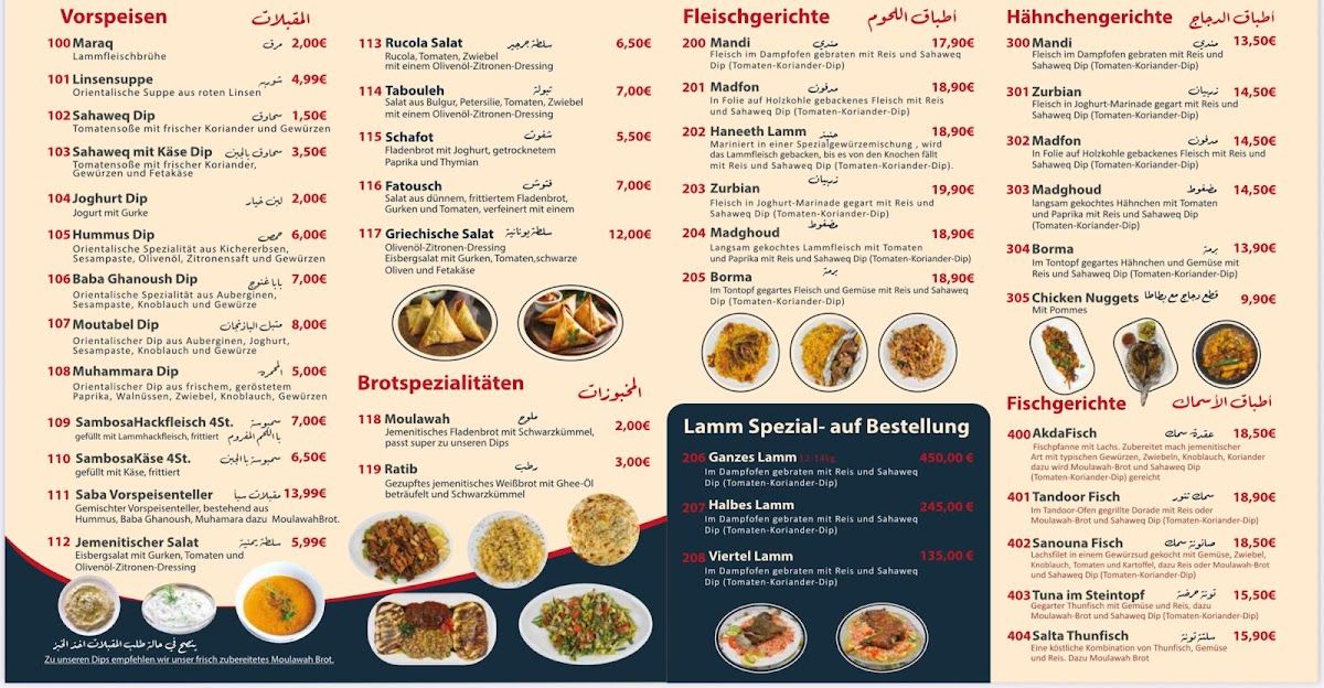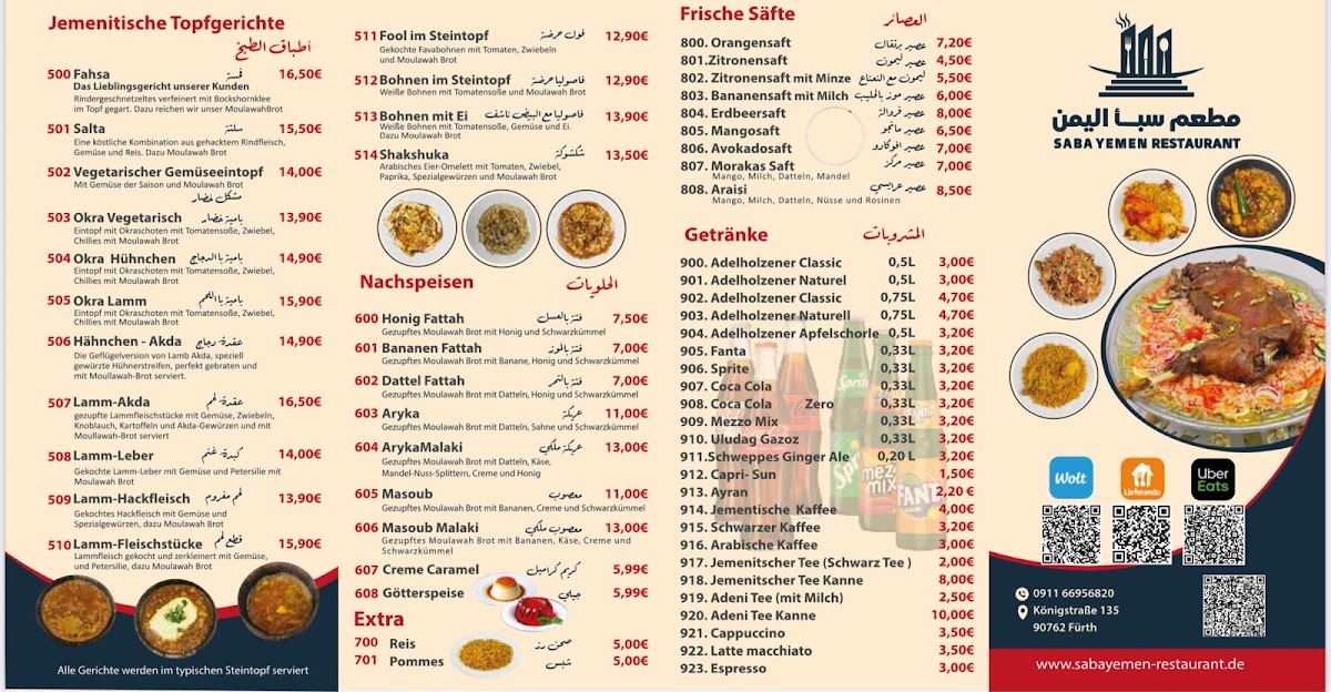 Saba Yemen in Fürth is a true gem for anyone craving authentic Yemeni cuisine. Located on Königstraße, this restaurant offers a diverse menu that celebrates the rich flavors of Yemen’s culinary heritage. The menu begins with delicious Vorspeise (appetizers), followed by traditional breads paired with tender lamb dishes. Whether you choose succulent lamb or flavorful chicken plates, each entrée bursts with aromatic spices. Seafood lovers can enjoy the expertly prepared fish dishes, while the hearty Topfgerichte (stewed pots) provide a comforting, slow-cooked experience. Saba Yemen also offers refreshing fresh juices and a selection of beverages to complement your meal. The desserts are a delightful finish, rounding out the cultural journey. Guests consistently praise the attentive service and warm atmosphere, enhancing the dining experience. For an unforgettable taste of Yemen’s culinary tradition, Saba Yemen stands out as a welcoming and flavorful destination.
